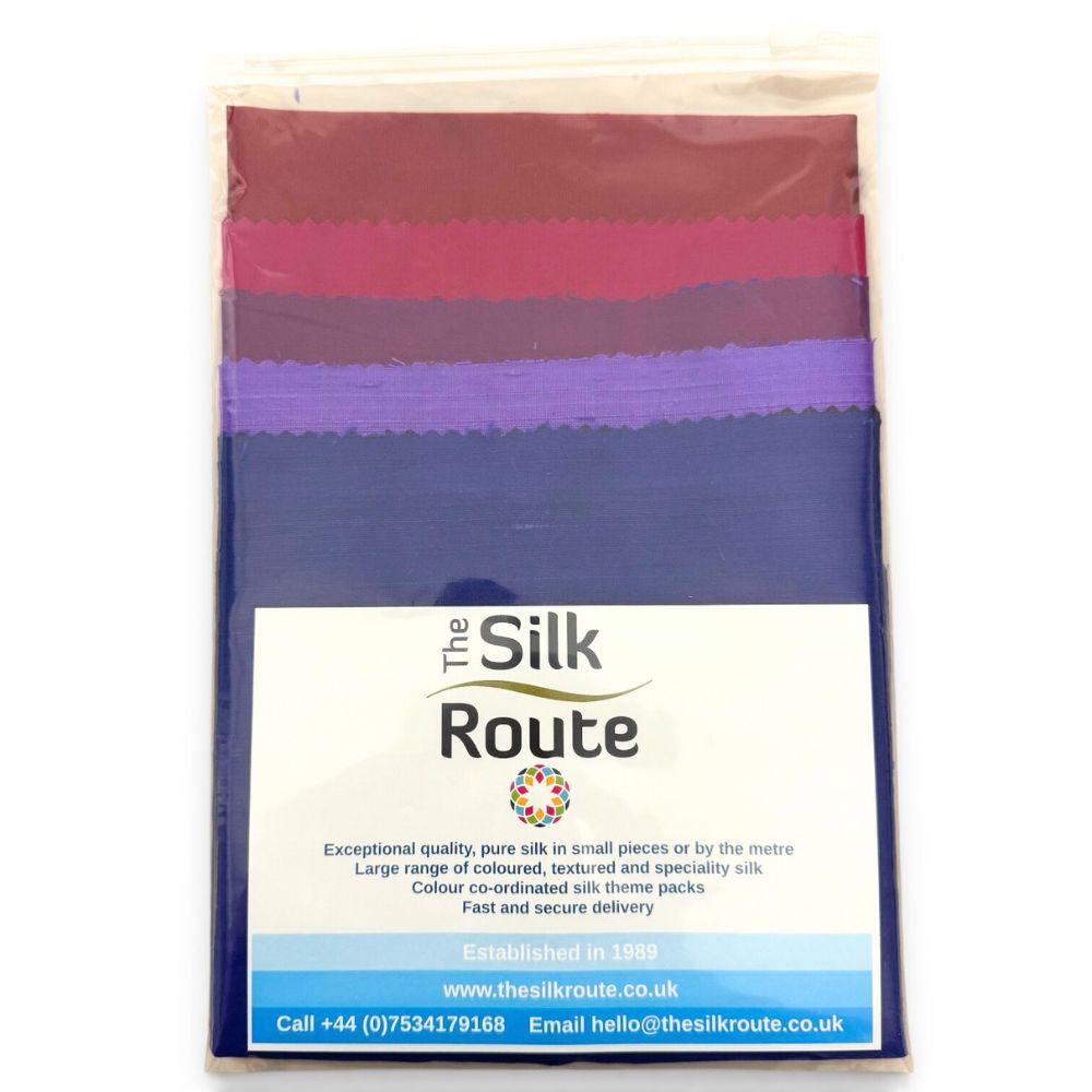Borgia Silk Theme Pack contains 5 pieces of Indian Silk Dupion in deep rich purples and crimsons.  The contents of the pack may vary from the picture illustrated.