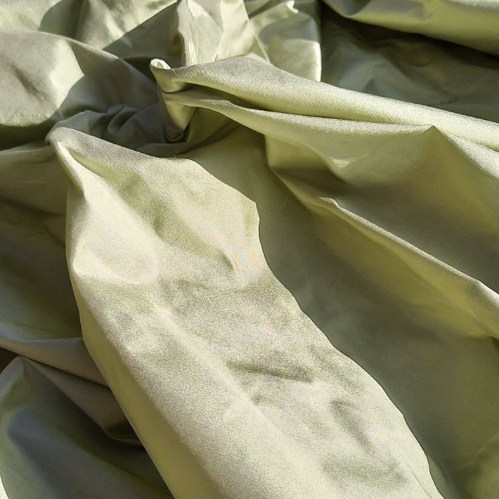 A pale, soft tea green with warm, creamy undertones. The silk’s gentle sheen lends the colour a smooth, luminous quality, shifting subtly between light olive and muted celadon as the fabric moves