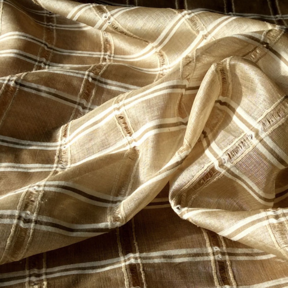 JB 759 is an Indian silk and consists of a grid of fine light brown threads interspersed narrow bands of mid brown and cream threads of a similar thickness across the width of the fabric. Similar fine light threads are interspered with narrower bands of 2 thicker dark cream and an open woven threads along the length. The pattern repeat is 5 cms across the width and 6 5 cms along the length. This gives an overall grid effect with a relatively light weight fabric.