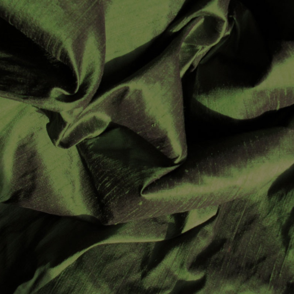 A rich forest green with warm olive undertones. The silk’s natural sheen brings depth and movement to the colour, revealing subtle shifts between deep moss, shadowed olive, and dark evergreen as the fabric catches the light.