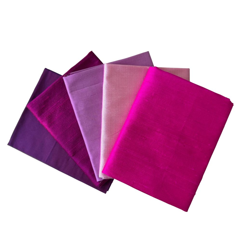 The Variety Silk Craft Pack contains 5 Fat Quarters (45 cm x 55 cm) of Indian Silk Dupion in varying complimentary tones grouped into one of the colourways listed below. Colours may vary from the images shown. 100% Natural Silk Dupion